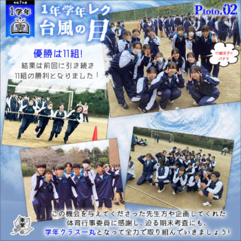 この機会を与えてくださった先生方や企画してくれた体育行事委員に感謝し、迫る期末考査にも、学年クラス一丸となって全力で取り組んでいきましょう!