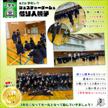 2年生としての締めくくりにふさわしい、活気あふれる学年レクとなりました。3年生になっても一丸となって励んでいけたらと思います。