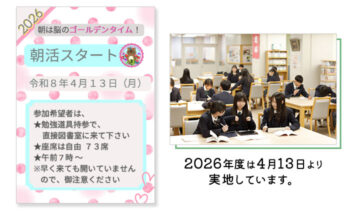 「朝の時間を有効に活用しよう」を合言葉に、毎朝授業始業前の60分間、図書室で主体的に課題を見つけて取り組む「朝活」。