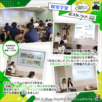 9月19日(金) 総合探究学習の時間にて卒業後の進路について2年生が自分たちで探究し、1年生に対してプレゼンテーションを行う『ポスターツアーが開催されました。