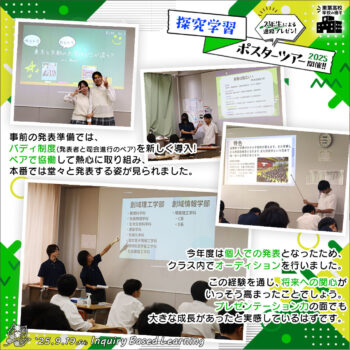 今年度は、昨年度までのグループ発表とは異なり、個人での発表としました。また、ポスターツアーに向けて発表者を決めるため、クラス内でオーディションを行いました。そのため、2年生にとっては、一人ひとりが将来のビジョンや自分自身と向き合う貴重な機会になったと思います。また、この経験を通じて、将来への関心がいっそう高まったことでしょう。プレゼンテーション力の面でも大きな成長があったと実感しているはずです。
