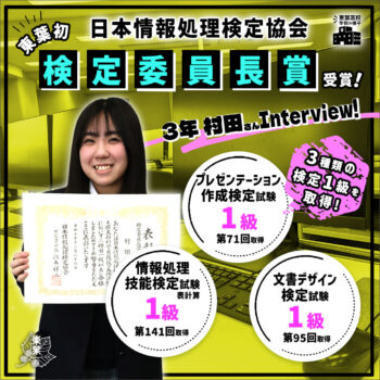 昨年中に開催された日本情報処理検定協会主催の検定試験で、1級を3種目取得(文書デザイン検定【第95回】・情報処理技能検定 表計算【第141回】・プレゼンテーション作成検定【第71回】)し、東葉初の「検定委員長賞」を受賞した3年生の村田さんにインタビューを行いました。