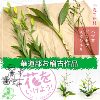 目指す部活動像 花を生けることを通して、仲間とコミュニケーションを取りながら互いの作品を認め合い、日常生活を豊かに過ごせるようになること。