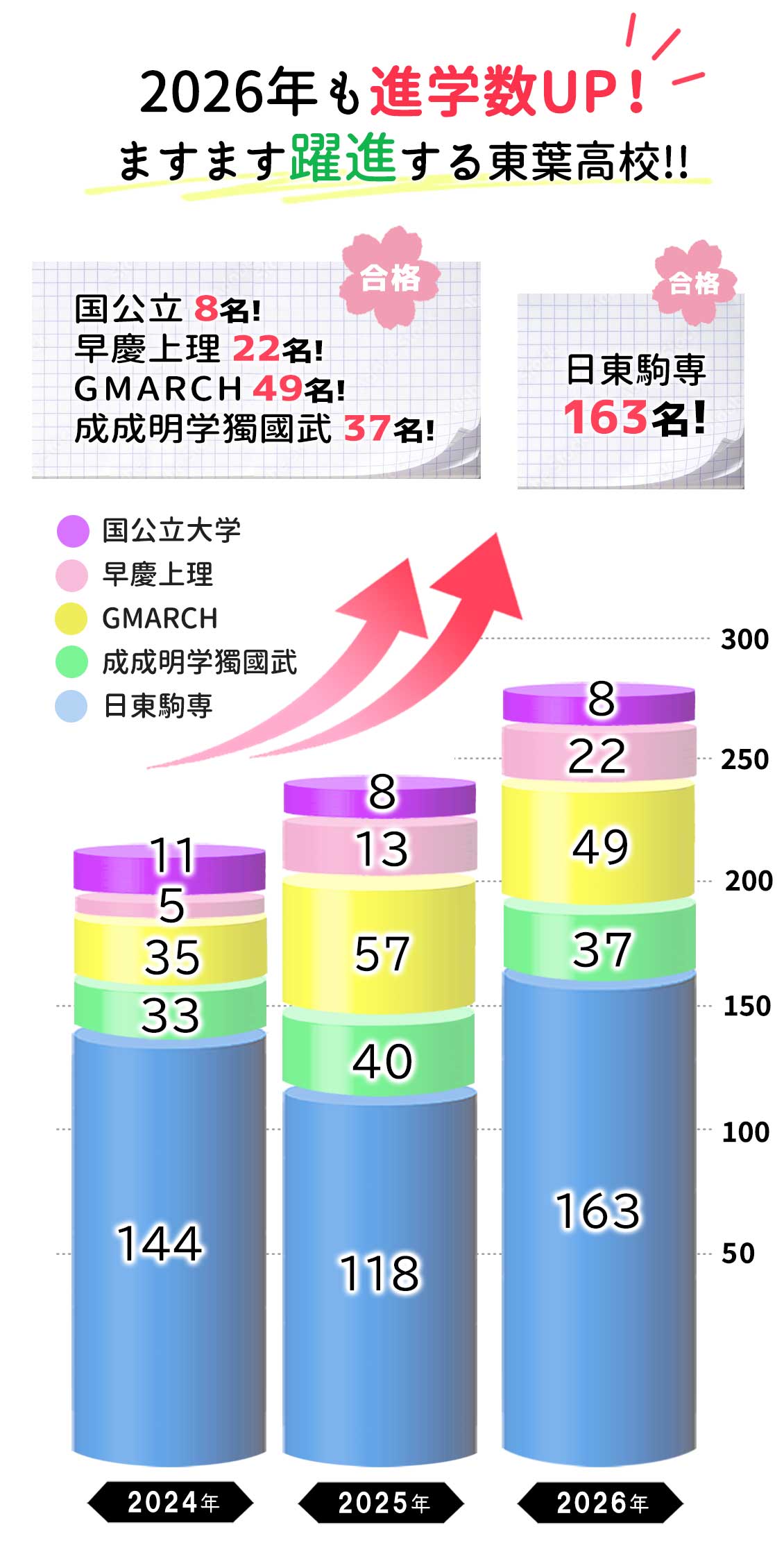 過去3年間の主な大学合格者数 令和8(2026)年4月時点のデータによる大学名2024年2025年2026年東京大学 1一橋大学1 筑波大学 1千葉大学1 横浜国立大学 1埼玉大学 1茨城大学3 秋田大学11 静岡大学1 福島大学 3 高知大学 1 京都府立大学1 名桜大 1前橋工科大学1 高知工科大学 1室蘭工業大学 1公立諏訪東京理科大学11 千葉県立保健医療大学12 防衛大学校 1早稲田大学239慶應義塾大学213上智大学1 4東京理科大学 96学習院大学276明治大学334青山学院大学132立教大学122420中央大学772法政大学101315芝浦工業大学2314東京都市大学1 2工学院大学 4東京電機大学318成城大学353成蹊大学316明治学院大学553獨協大学91712國學院大學565武蔵大学868日本大学444167東洋大学654366駒澤大学111111専修大学242419順天堂大学7713東邦大学6914東京農業大学716神田外語大学767津田塾大学2 東京女子大学4 1昭和女子大学436 過去3年間の主な大学合格者数 令和8(2026)年4月時点のデータによる大学名2024年2025年2026年東京大学 1一橋大学1 筑波大学 1千葉大学1 横浜国立大学 1埼玉大学 1茨城大学3 秋田大学11 静岡大学1 福島大学 3 高知大学 1 京都府立大学1 名桜大 1前橋工科大学1 高知工科大学 1室蘭工業大学 1公立諏訪東京理科大学11 千葉県立保健医療大学12 防衛大学校 1早稲田大学239慶應義塾大学213上智大学1 4東京理科大学 96学習院大学276明治大学334青山学院大学132立教大学122420中央大学772法政大学101315芝浦工業大学2314東京都市大学1 2工学院大学 4東京電機大学318成城大学353成蹊大学316明治学院大学553獨協大学91712國學院大學565武蔵大学868日本大学444167東洋大学654366駒澤大学111111専修大学242419順天堂大学7713東邦大学6914東京農業大学716神田外語大学767津田塾大学2 東京女子大学4 1昭和女子大学436