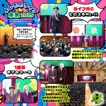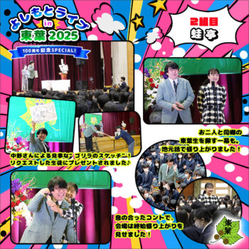 恒例となった某体育の先生のモノマネをはじめ、地元ネタを織り交ぜたコントで、後輩である生徒たちを笑いの渦に包み込みました。
